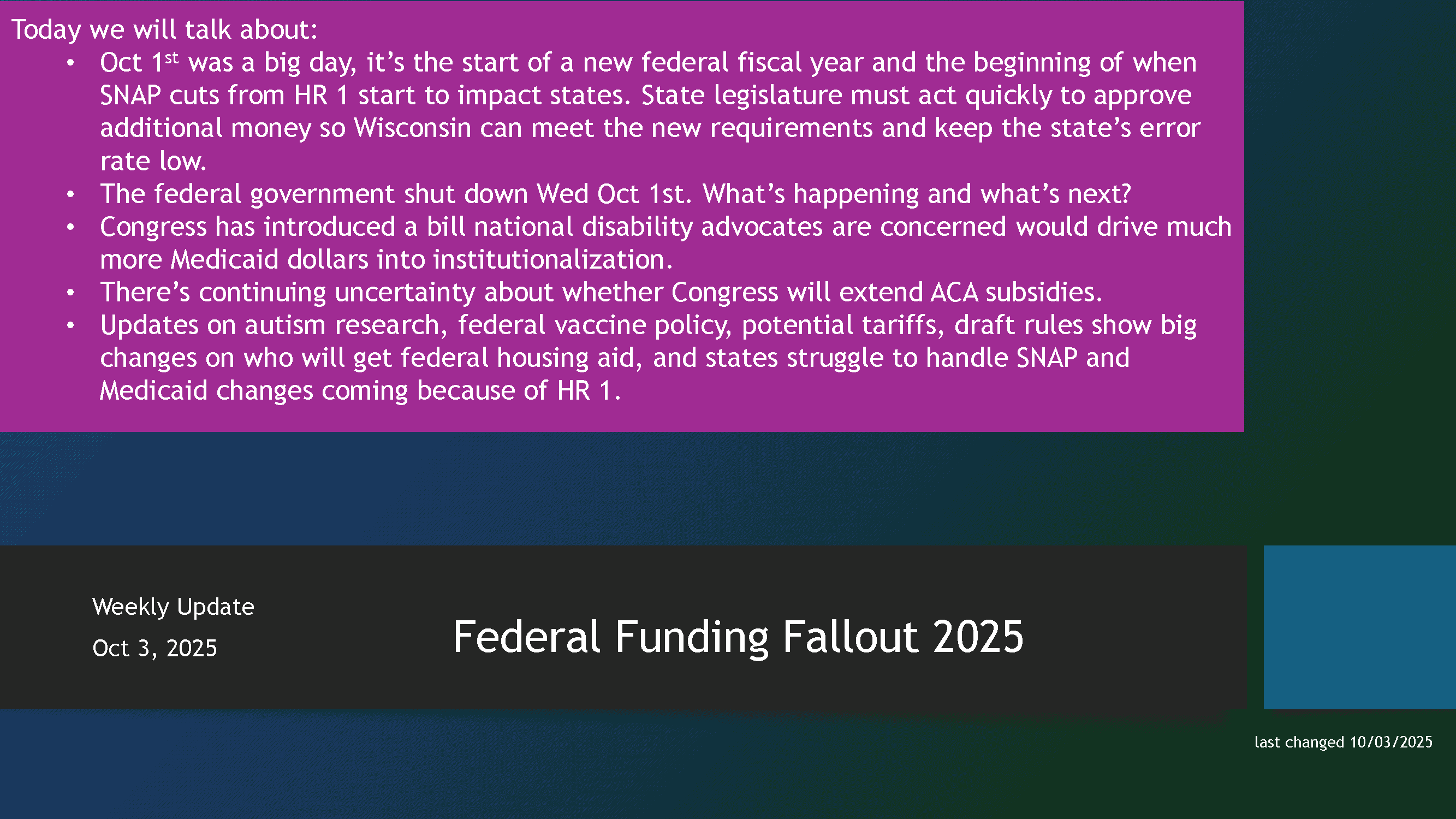 Oct 1st was a big day, it’s the start of a new federal fiscal year and the beginning of when SNAP cuts from HR 1 start to impact states. State legislatures must act quickly to approve additional money so Wisconsin can meet the new requirements and keep the state’s error rate low.