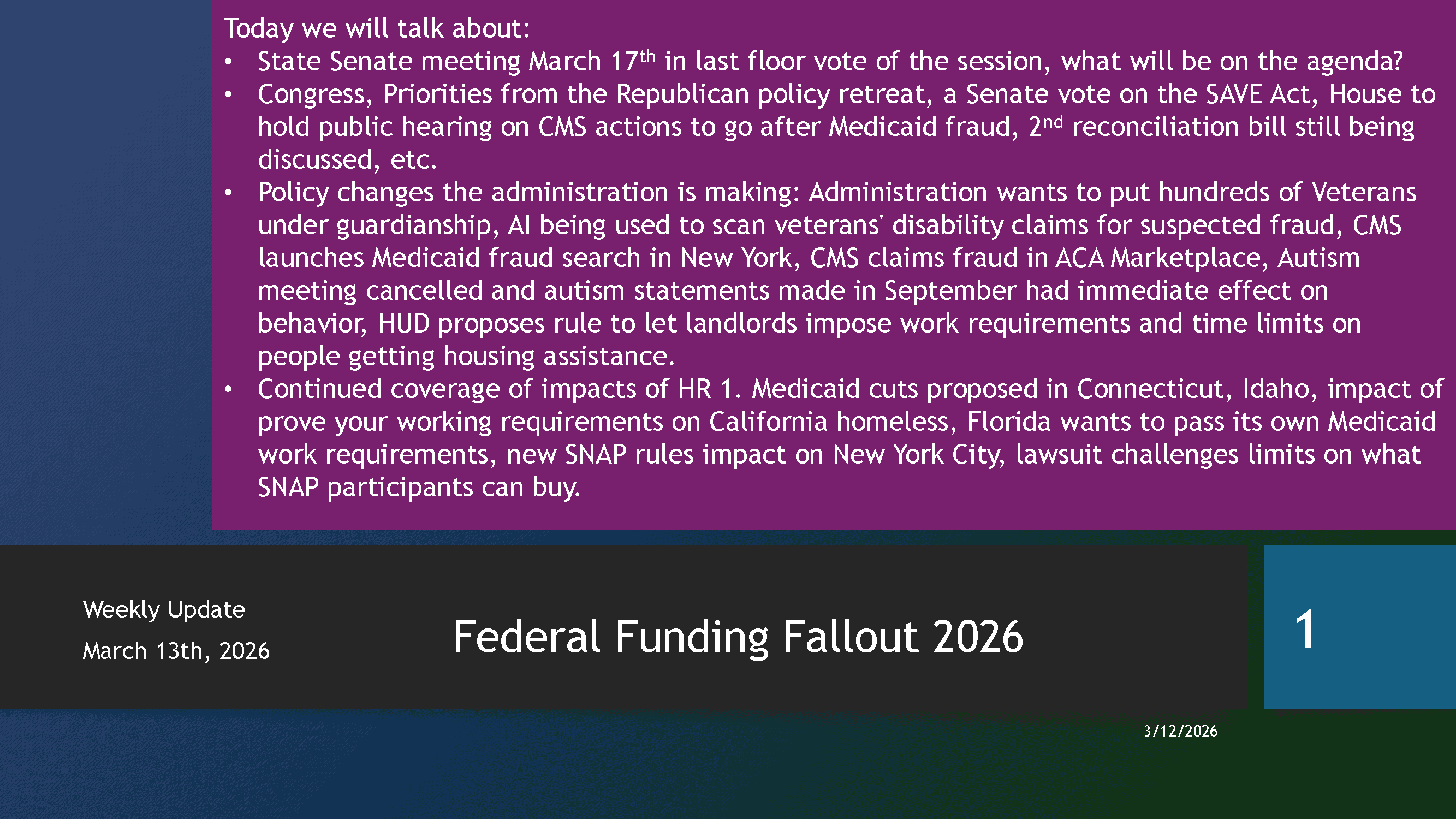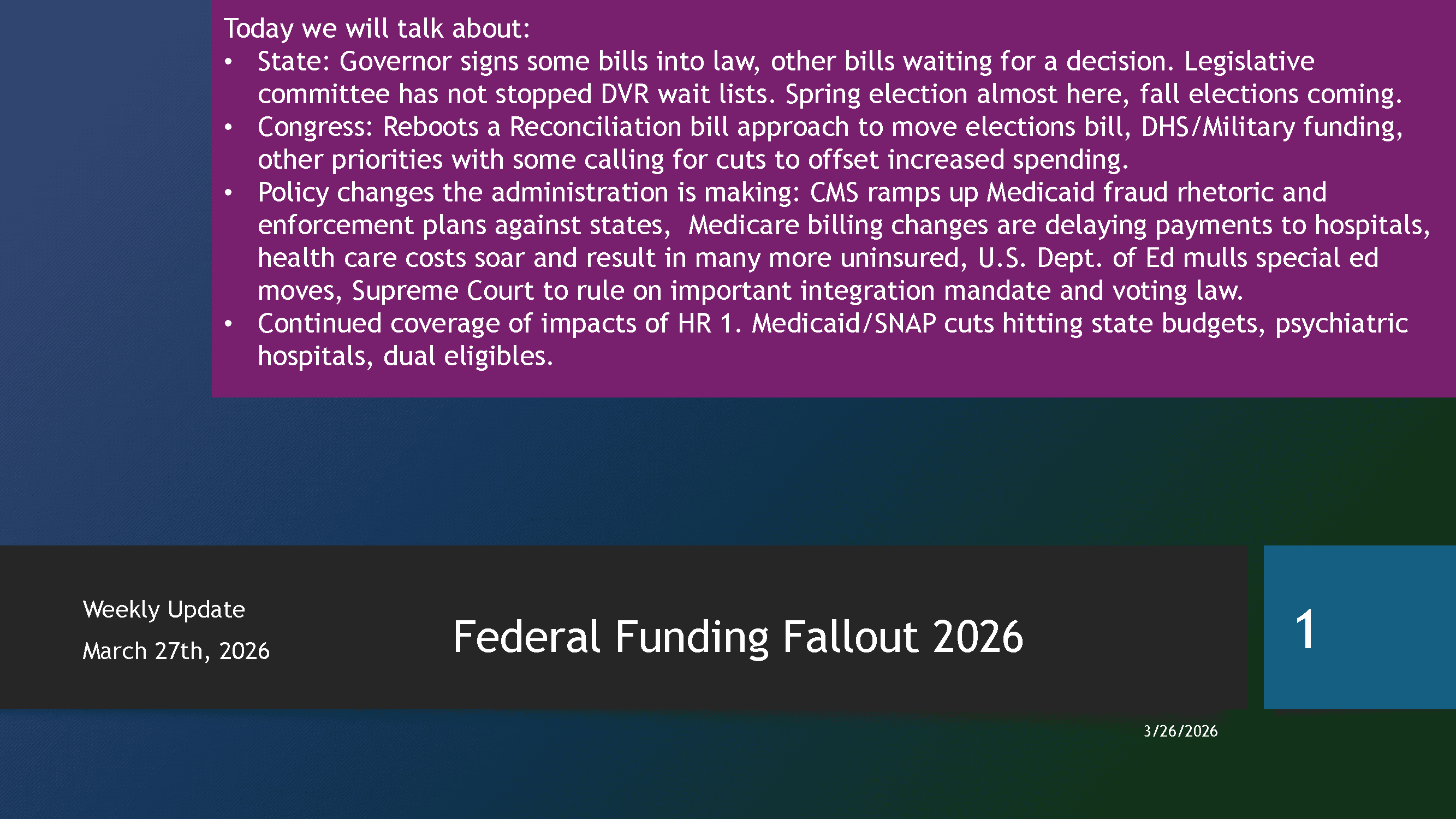Medicaid. Social Security. Disability Programs. Education. Federal Budget. Join us every Friday from 9-10:30 am to get the latest on Federal funding cuts and federal agency changes that impact people with disabilities.